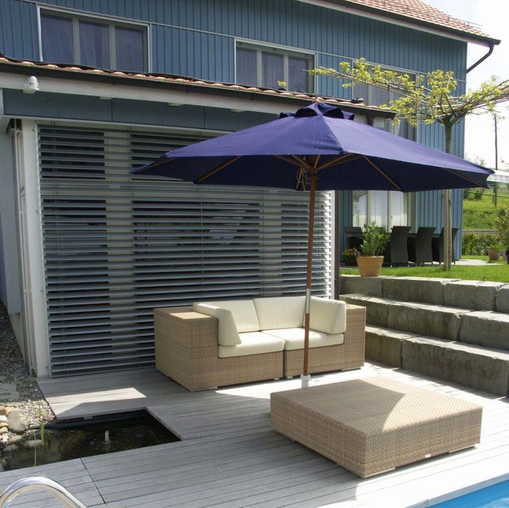 Neben herkömmlichen Sonnenschirmen bieten wir auch Lamellen-Schirme an, die ästhetisch interessant und winddurchlässig sind.